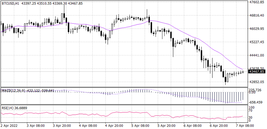 من نظرة عامة على السعر على الإطار الزمني اليومي، يبدو سعر البيتكوين صعوديًا. ومع ذلك، من الإطار الزمني لكل ساعة، كان السعر يصنع سلسلة من الشمعات ذات القراءة الهابطة. يقوم السعر حالياً بالتراجع إلى المتوسط المتحرك لفترة 20 عند المستوى 43،660 والذي من المرجح أن يدفع السعر للأسفل في الاتجاه الهبوطي. يظهر كلا من مؤشر القوة النسبية RSI وMACD حركة تصحيحية للسعر إلى مستوى 43,660.