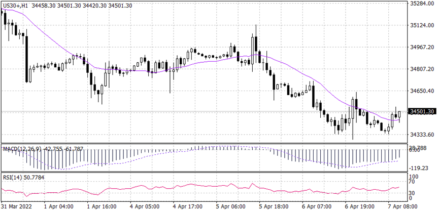 من النظرة العامة لسعر الداو جونز، يظهر الإطار الزمني اليومي إتجاه صعودي. أظهر السعر انتعاشاً حول المستوى 34,330 الذي يتقاطع بين خط الاتجاه الصاعد والمتوسط التحرك لفترة 20 شمعة. يظهر كلا من مؤشر القوة النسبية RSI وMACD مقاومة حول 34,330.