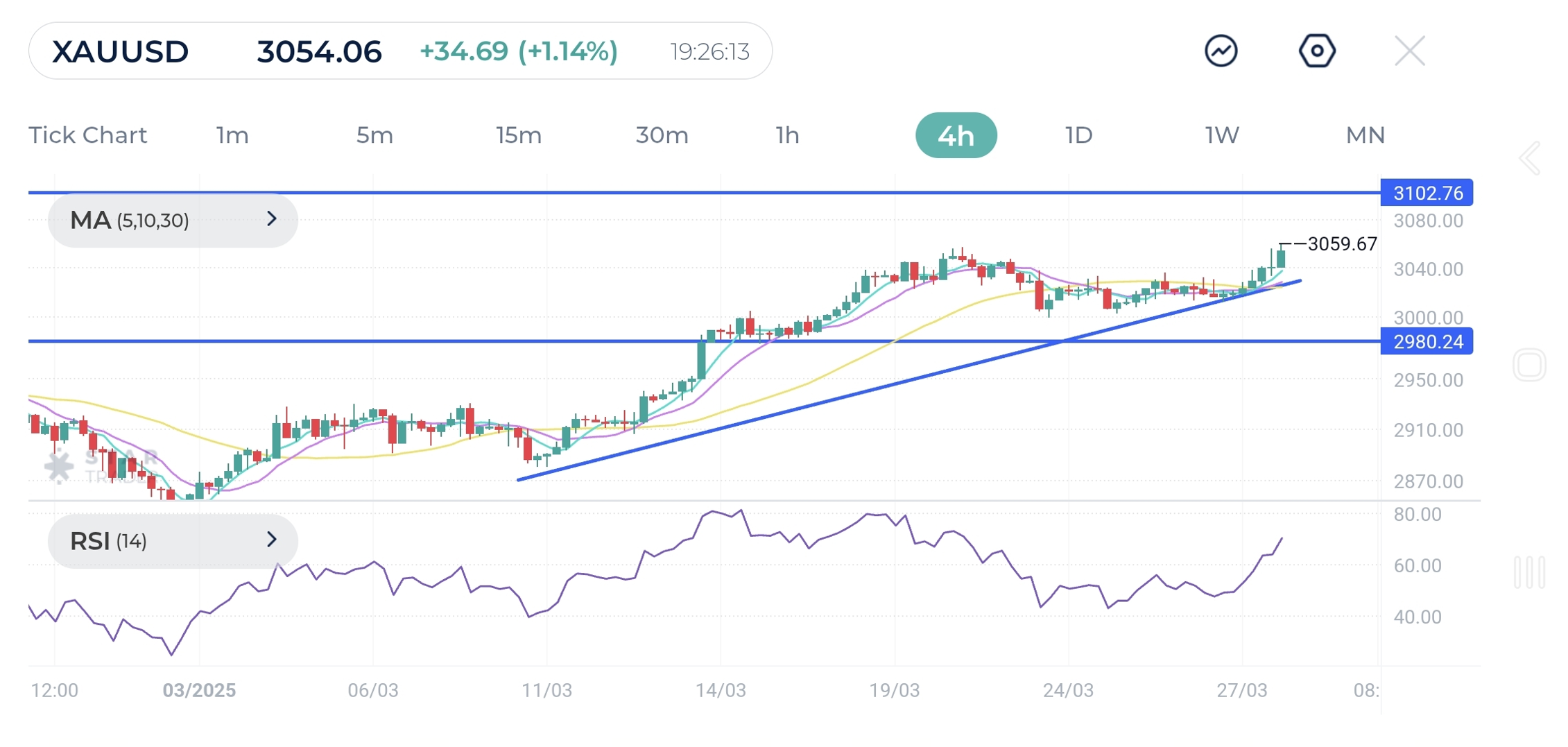 Forex Market Analysis & News – This Week (Mar 25–28): Today’s forex market analysis (Week of March 25) shows that gold has shown renewed buying interest, finding support at the psychological level of 3000 and gaining upward momentum in the short-term. The latest pullback was due to profit-taking and the broader bullish trend remains intact, with the price trading along the secondary short-term trendline from mid-March. The latest break above the 3057 all-time high would provide buyers with confirmation to target new all-time highs above 3100. As long as the RSI shows no signs of overshooting, the buy side may keep the pressure on and a limited retracement would be seen as a buy signal. Live forex analysis for this week highlights gold’s bullish continuation as long as support holds. The demand zone 2980-3000 is a major level to maintain the bullish fuel.