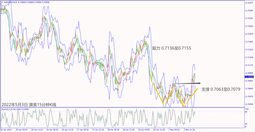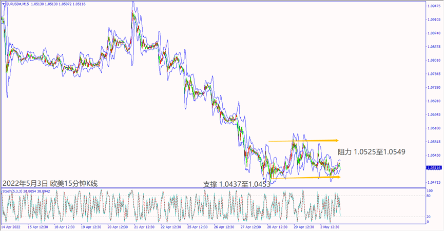 日级别线图,近期在1.0500上方盘整,5日均线冲不过,可能下探新低;15分钟K线,短线处于区间震荡,一旦跌破盘整底部,大有可能回测支撑。