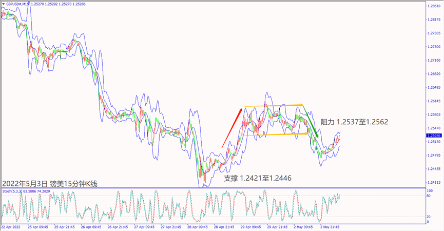 日级别线图,近三天在1.2500关口附近震荡,冲不过5日均线,可能下探新低;15分钟K线,短线出现箱型反转,盘整底部反压,大有可能回测支撑。