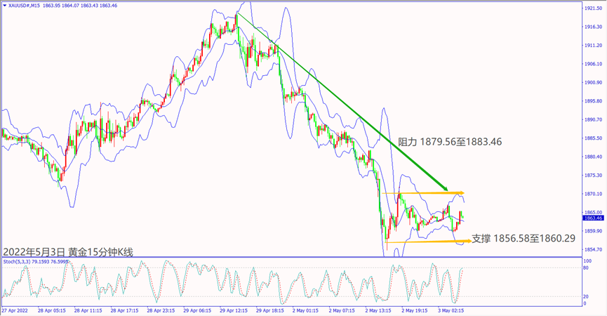 周一(2日)据CME“美联储观察”对5月加息50个基点板上钉钉,亚洲和欧洲市场抛售黄金造成价格跌落至1880关口附近整理。晚间美国贸易代表戴琪称讨论解决物价飙升问题,美元和美股出现齐涨,造成黄金价格扩大下跌约45美元,尾盘守在1860关口上方整理。