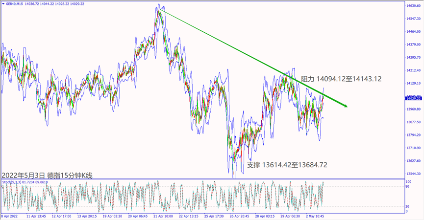 日级别线图,近期在14000关口附近震荡,一旦跌破5日均线,可能延续跌势;15分钟K线,短线跌深反弹,下降趋势线反压,大有可能下探支撑。