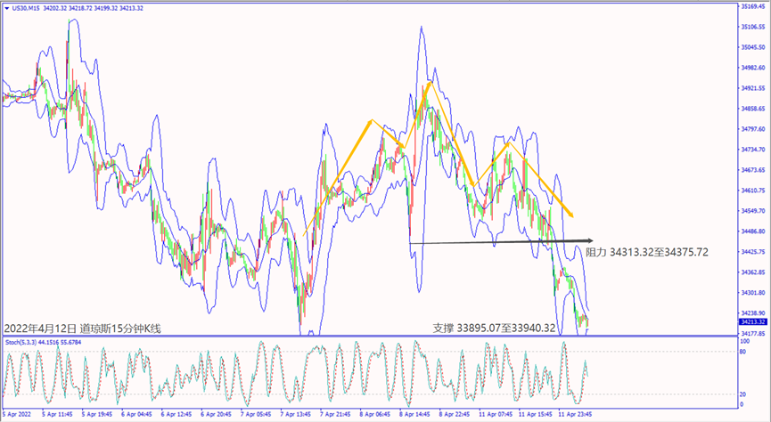 日级别线图,连续下跌掼破60日均线,30日均线若跌破,可能延续跌势;15分钟K线,出现头肩顶反转,颈线阻力冲不过,大有可能下探支撑。
