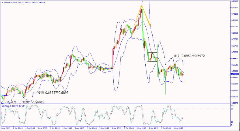 昨天(5日)日本财务大臣称警惕任何剧烈的外汇波动,一旦日本央行干预日元可能出现下跌,美日若跌破小时布林带中轨123.71,建议可短空操作。预期今天(6日)欧盟公布对俄罗斯扩大制裁,一旦俄罗斯宣布反制裁可能利淡欧元,欧美冲不过小时布林带上轨线1.0912,建议可短空操作。近期避险资金涌入纽元引起汇率剧烈波动,若新西兰央行进行干预恐利淡纽元,纽美若跌破5日均线0.6938,建议可短空操作。