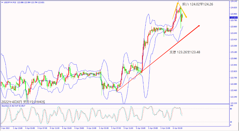 日级别线图,连续上涨重回5日均线,124.00关口冲不过,可能出现回调;15分钟K线,早上出现倒V反转,上升趋势线若跌破,大有可能下探支撑。