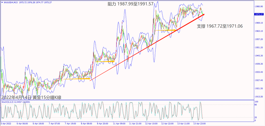 週三(13日)新西蘭聯儲利率決議對經濟復甦示警利好美元上漲,也讓黃金價格回落至1970關口附近震盪整理。俄羅斯擴大砲火襲擊烏克蘭東部,歐美股指皆下跌而避險資金帶動黃金價格漲至1980關口附近整理。晚間加拿大央行宣布加息50個基點,美元出現大跌但歐美股指逆勢上漲,也讓黃金維持在1980美元附近整理。