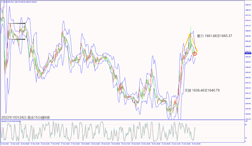 日級別線圖,長紅K創兩週新高,前波盤整底部反壓,可能回測5日均線;15分鐘K線,圓弧頂反轉,布林帶中軌沖不過,可能下探起漲支撐。