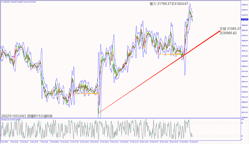 上週五(21日)新美聯儲通訊社預期12月可能縮小加息幅度,利好道瓊斯和納指逆勢大漲超3%。預期今天(24日)歐元區公佈製造業數據大都不佳,德指沖不過60日均線12,908,建議可短空操作。預期今天美國公佈經濟數據好壞參半,道瓊斯若守住小時布林帶下軌線30,985,建議可短多操作。