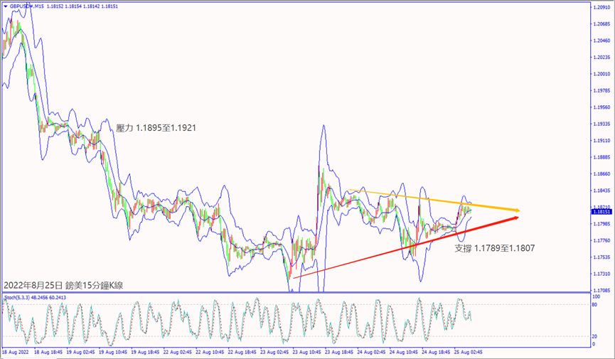 日級別線圖,近三天在1.1800關口附近震盪,一旦突破5日均線,可能大幅度反彈;15分鐘K線,出現上升三角形,盤整頂部若刺破,大有可能挑戰上方壓力。