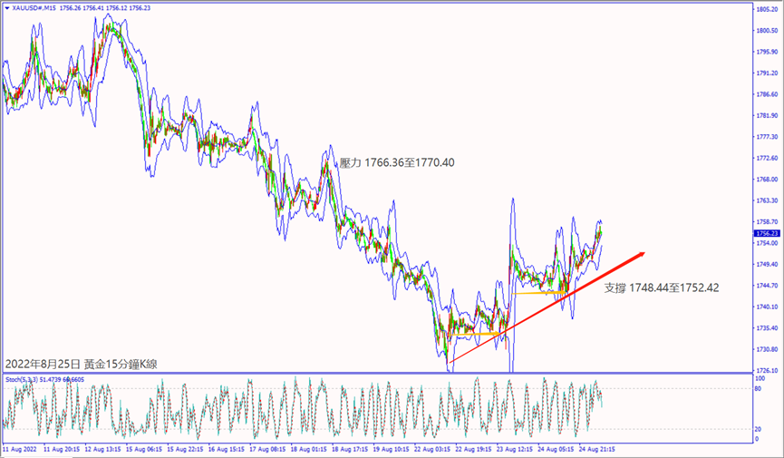 昨天(24日)受到美元指數下跌影響,市場買盤帶動黃金價格上漲約13美元,美債收益率攀升也讓黃金價格回落至1750美元附近整理。預期今天美國公佈第二季度GDP不佳恐造成美元和美股下跌,黃金價格若守住小時布林帶中軌1751美元,建議可短多操作。